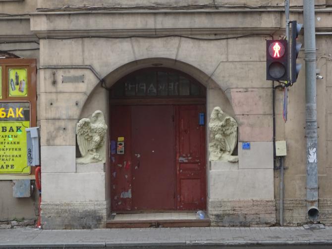Дом украшен горельефными изображениями орлов. Гипсовые орлы сидят по краям парадного входа.