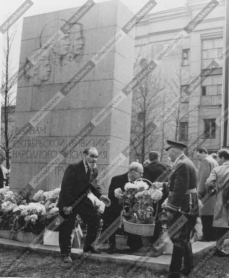 * Общий вид митинга, посвященного открытию памятника воинам Октябрьской дивизии народного ополчения на Садовой улице (арх. В.Ю.Милейковский) (панорама из 2-х снимков). Фото - Баранов Иван Александрович ** Возложение венков к памятнику воинам Октябрьской дивизии народного ополчения на Садовой улице (арх. В.Ю.Милейковский) Фото - Рубацкий Владимир Семенович В 1964 г. в сквере возле школы был воздвигнут гранитный монумент в честь воинов народного ополчения. Это прямоугольная стела из серого кованного (неотшлифованного) гранита. На лицевой стороне изображены солдат, девушка-санитарка и воин-ополченец. Под изображением текст: «Воинам Октябрьской дивизии народного ополчения от трудящихся района. Январь 1964». На тыльной стороне стелы «С этого места 4 сентября 1941года ушли в бой за нашу Родину, за Ленинград воины-ополченцы Октябрьского района». У основания стелы установлены три гранитных надолба. Общая композиция создана арх. В. Ю. Милейковским. Высота монумента 4,8м. (по материалам [], стр. 376) 13 комментариев 3886 просмотровДобавил: Mary, 22 Октября 2008, 11:58