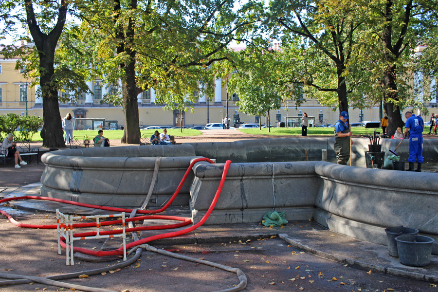В нашем городе в далеком прошлом фонтаны строились следующим образом: под чашей формировалась большая камера, которая закрывалась кирпичными сводами. А потом на кирпич накладывали те самые гранитные блоки, которые формировали чашу. Здесь как раз такая система: под фонтаном находится большая камера, где скапливается вода – рассказывает заместитель начальника управления городской водной инфраструктуры ГУП «Водоканал» Андрей Чистяков. – Это создавало неудобство при обслуживании. Поэтому в середине 2000-х годов фонтан прошел реконструкцию со всеми требованиями по защите исторических памятников. Были сохранены внутренние помещения, усилены своды. А вот гидравлическую схему переделали. Тогда-то все насосное оборудование перенесли в отдельное помещение. При этом водная картина – тот самый рисунок струи фонтана – сохранилась. Но и в низком помещении под чашей фонтана приходится работать: именно там труба разветвляет воду на насадки, там же система слива чаши и коллектор. Все это требует регулярной проверки. (Санкт-Петербургские ведомости. 2014. № 71(5598) (18 апр.) С. 2 Электронная копия с сайта РНБ nlr.ru)