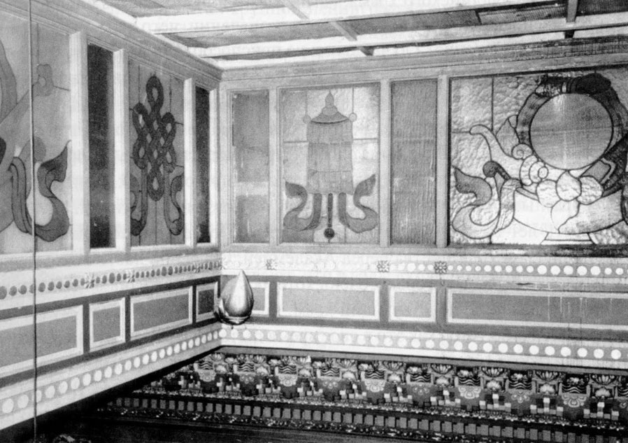 Основной алтарь храма с 2,5-метровой статуей Будды, изваянной из алебастра бурятскими мастерами, находился в просторной нише в главном молитвенном зале - факти- чески, в нижнем этаже северной башни по оси здания. Прежде всего поражало отсутствие окон - свет в основное помещение храма, как уже отмечалось, проникал сверху, через остекленную часть крыши и потолка (световой фонарь), и падал на восьмилепестковый лотос, выложенный цветными плитками в полу и воспроизводивший символические очертания Шамбалы; чуть ниже лотоса, у самых дверей, из тех ж е плиток была составлена свастика - древний арийский (индо-буддийский) символ счастья. В центре зала, как раз под квадратным световым проёмом в потолке, стояли два длинных стола, на которых были разложены ритуальные принадлежности - колокольчики, раковины, чашечки с рисом, Завораживало и богатое убранство молитвенного зала - писанные на ткани буддийские иконы - танка, среди которых было и изображение Блистающей Шамбалы, различные декоративные аксессуары - сшитые из разноцветных парчовых лоскутов цилиндрические, развешанные между колоннами и перед алтарной нишей.