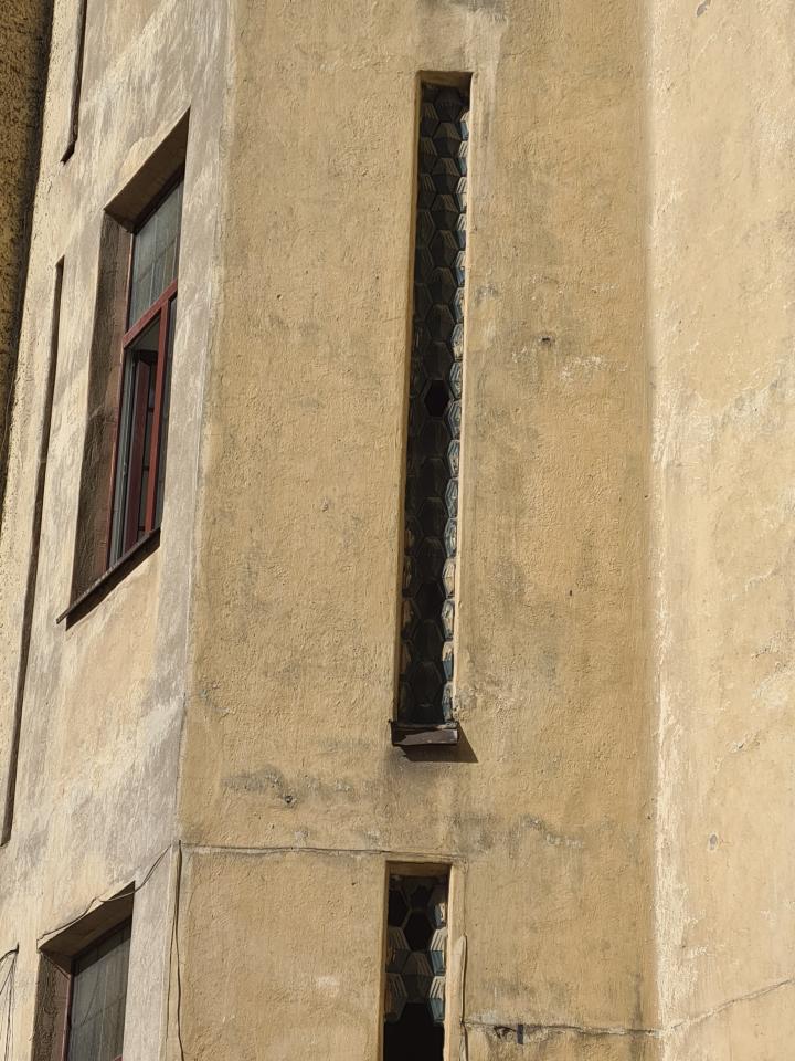 На дворовом фасаде корпуса по Ковенскому переулку в стенах ризалита, примыкающего к дому на соседнем участке, утроено десять узких оконных проемов. Они находятся на одном уровне с двустворчатыми окнами освещения промежуточных площадок черной лестницы. Остеклены голубыми кирпичами Фальконье шестиугольной формы. Учтено по пять окон с кирпичами Фальконье с правой и левой стороны ризалита.