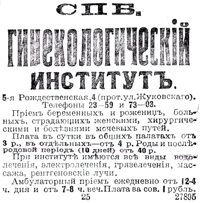 Дано описание 7-этажного здания, специально перестроенного и оборудованного, по 5-й Рождественской ул., 4. Это лечебное заведение получило дорогостоящую рекламу в виде отдельного книжного издания, вышедшего в Берлине без указания на титуле года: СПБ. Гинекологический институт с хирургическим отделением. СПБ. Женская электро-водо-грязелечебница со стационарным отделением. С.-Петербург 5-ая Рождественская № 4. ... В сущности это можно считать юбилейным альбомом, с отдичными фотографиями фасада, интерьеров и оборудования, персонала, подготовленный к 10-летию заведения. Указано, что открыто оно как лечебница на 8 кроватей в 1898 году кружком врачей. В 1907 году устроен Институт физических методов лечения, получивший наименование С.-Петербургской женской электро-водо-грязе-лечебницы. Имеется детальное описание всех помещений и специально выстроенных зданий, занимаемых Гинекологическим институтом в разное время, и здания электро-водо-грязелечебницы. [Об освящении в Петербурге нового помещения Частного гинекологического института] // Журн. женских болезней... 1908. № 3. С. 510. - Хроника.; добавил )