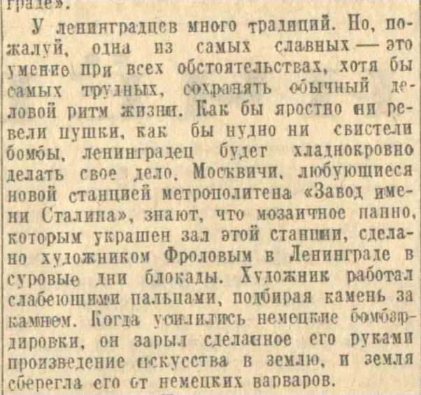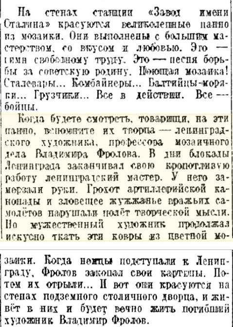 "1929 год - довольно сложный год для семьи Фроловых. По постановлению Ленсовета о выселении владельцев из их домов, несмотря на то что он занимался изготовлением мозаик для мавзолея Ленина, Фролов и его семья были изгнаны из дома [Большой пр. ВО, 64 http://www.citywalls.ru/house131.html ]", - рассказал внук Владимира Фролова.
